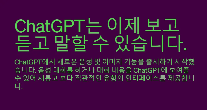 어제 오픈 AI 블로그 기사를 보니 이제 ChatGPT가 새로운 음성 및 이미지 기능을 추가했다고 합니다. 멀티모달 기능을 지원하면 이제 음성 및 이미지로 ChatGPT와 소통을 하여 글로만 설명하기 힘들었던 부분에 대해 더 원활하게 대화할 수 있을 것 같네요.